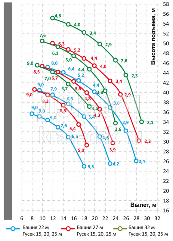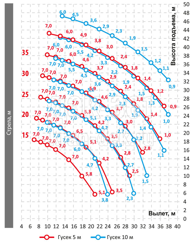 - Основная стрела 15м содержит в себе вставку 5м и наращивается до 40м при помощи вставок длиной 5 и 10м. При увеличении длины стрелы максимальная грузоподъемность снижается.