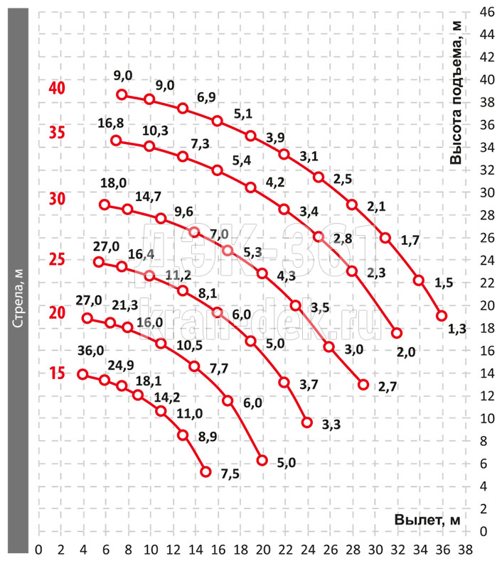 ДЭК-361: грузовая характеристика главного подъема (на стреле)