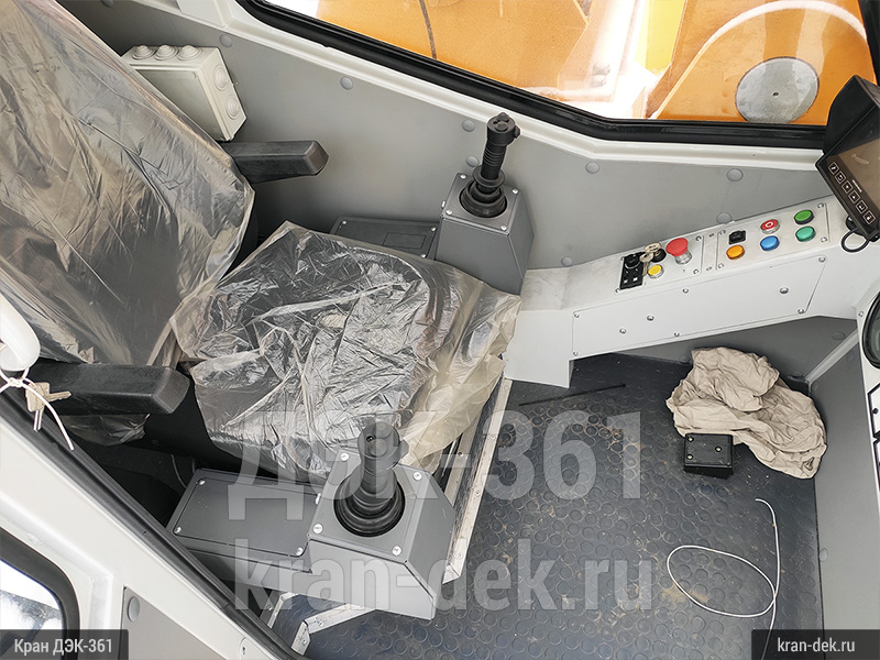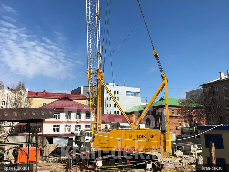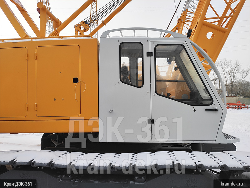 — Высота подъема на основной стреле 15м увеличивается до 40м за счет вставок 5м и 10м с быстромонтируемыми соединениями. — Дополнительно устанавливаемый жесткий гусек длиной 1м 5м или 10м под углом 10° или 30° к оси стрелы с крюком вспомогательного подъема обеспечивает грузоподъемность до 7т при работе с меньшими грузами. Также может быть установлен конек 1м с крюком вспомогательного подъема. — Для работы возле высотных сооружений кран комплектуется маневровым гуськом (башенно-стреловым оборудованием) 15, 20 или 25м. — Гусеничный ход крана обеспечивает хорошую проходимость в условиях неподготовленной площадки. — Новый подход к компоновке и проектированию узлов позволяют крану перемещаться с грузом массой до 32 тонн. — Питание от внешней электросети 380В 50Гц, — обеспечивает бесшумность и экологичность при работе в городской среде, наряду с существенной экономией на топливе. — Электронное управлением обеспечивает высокую точность выполнения монтажных операций. | — Благодаря несъемной кабине, складывающемуся порталу и сдвижному гусеничному ходу возможна транспортировка крана по дорогам общего пользования на трейлере, что и ускоряет ввод техники в эксплуатацию. — Для работы в холодное время года ДЭК-361 оснащается предпусковым жидкостным подогревателем, что позволяет эксплуатировать его в российских условиях без существенного увеличения стоимости. — Использование современных комплектующих и механизмов с высокой удельной мощностью обеспечили крану компактные габариты и минимальное давление на грунт. — Эргономичная кабина соответствует современным требованиям к комфорту, имеет широкий обзор и хорошую видимость рабочей области и зоны расположения грузовых лебедок. Создать оператору максимальное удобство помогает кресло с многочисленными регулировками, амортизацией, пневмоопорой для спинки и подголовником. Управление рабочими операциями осуществляется при помощи джойстиков. |
