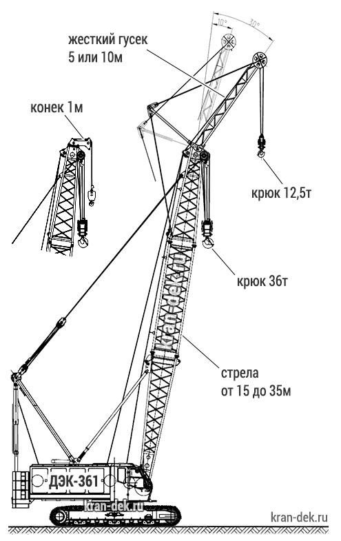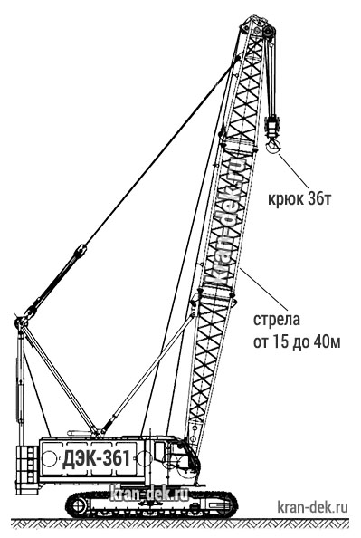 Тема страницы: Гусеничный кран ДЭК-361 (36 тонн): описание, технические характеристики, грузовысотные характеристики, технические данные, схема, комплектация, параметры, диаграмма. Продажа гусеничных кранов ДЭК-361: купить, стоимость, цена на новый кран ДЭК-361 (ДЭК361, ДЕК-361, ДЕК361). Гусеничный кран 36 т 36 тн (кран 36т, 36тн, 36тонн). Устройство стрелового самоходного крана на гусеничном ходу ДЭК-361: перевозка, транспортировка, габаритные размеры (габариты), система безопасности, особенности. электросхемы гусеничных кранов